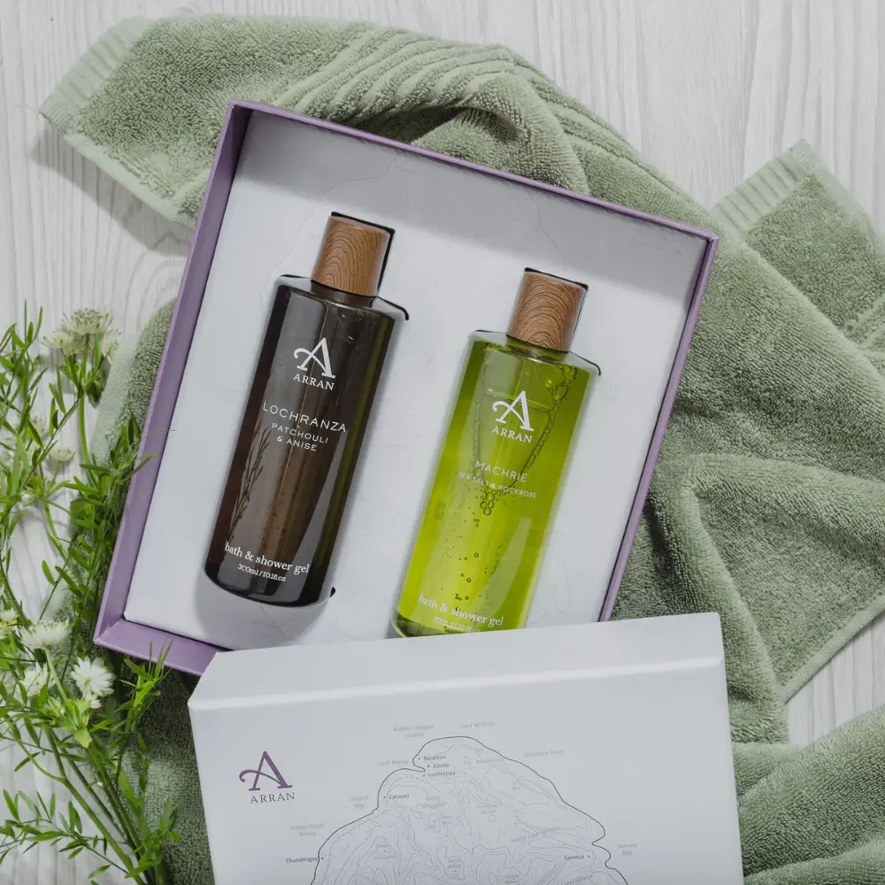 This beautifully presented gift set contains two 300ml bath and shower gels — Machrie (Sea Salt & Rockrose) and Lochranza (Patchouli & Anise) — expertly blended with natural extracts and pro-vitamin B5 to cleanse, condition, and revitalise the skin.